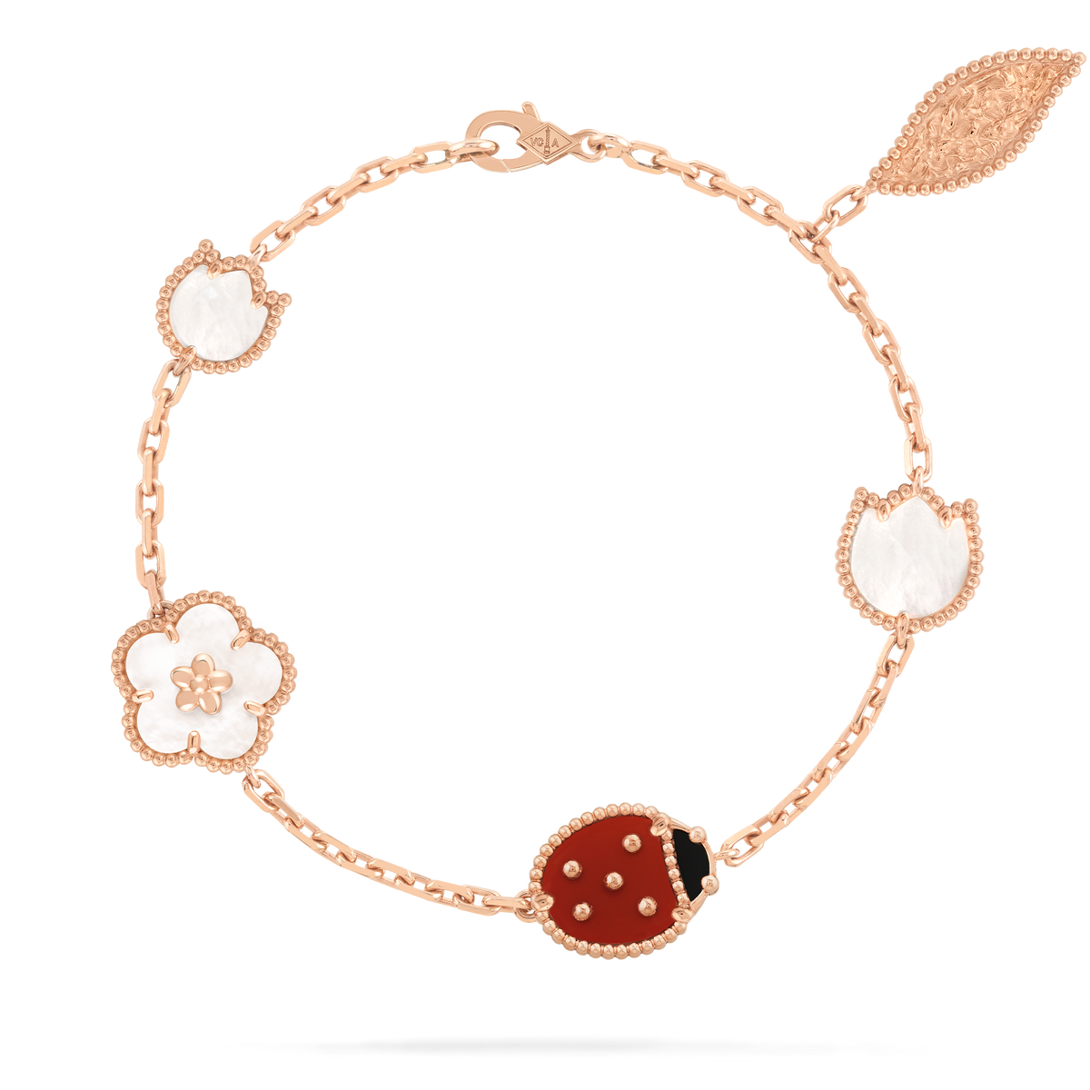 Doğanın sevimli ruhunu bileğinizde taşıyın. Vivella bileklik; zarif bir uğur böceği, incelikli çiçekler, narin yaprak motifi ve sedef görünümlü detaylarıyla doğadan ilham alan şiirsel bir tasarım sunuyor. Her bir figür, şans, yenilik ve sadeliği sembolize ederken; pembe altın kaplama yumuşak tonlarıyla romantik bir şıklık yaratıyor. Hem günlük kombinlerinize zarif bir dokunuş hem de özel anlarda anlamlı bir hediye olacak kadar özel.