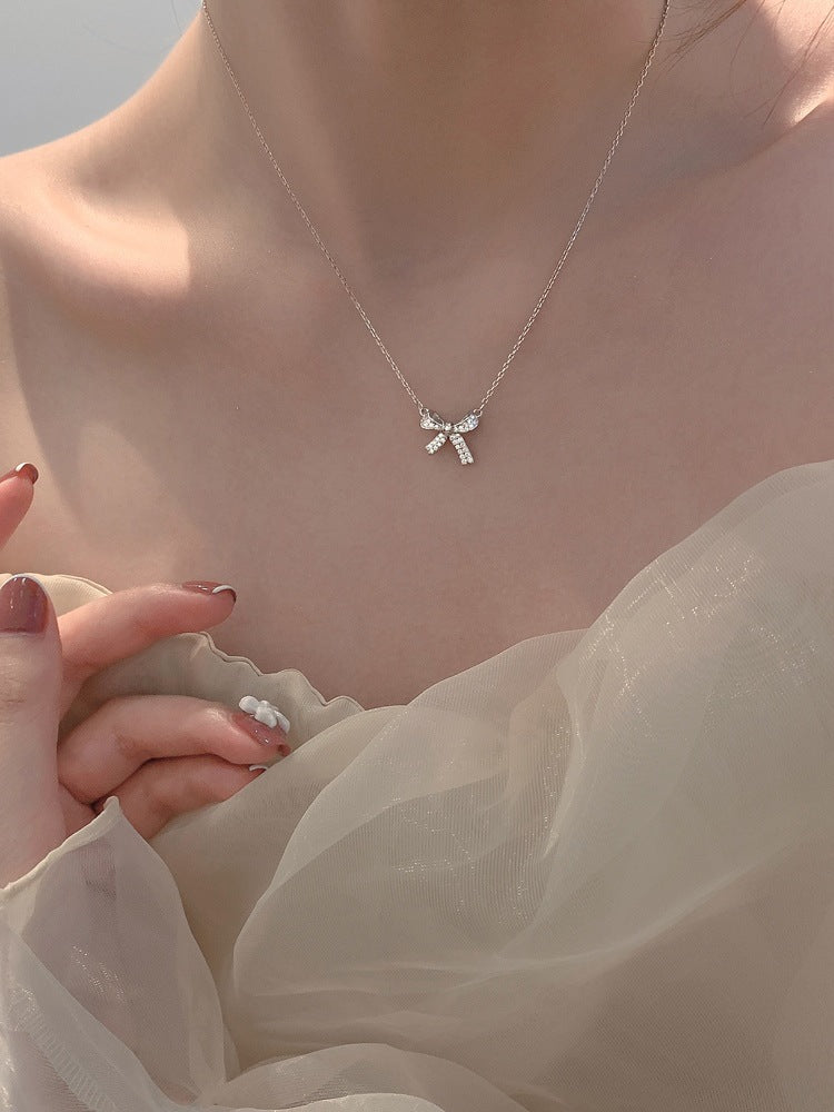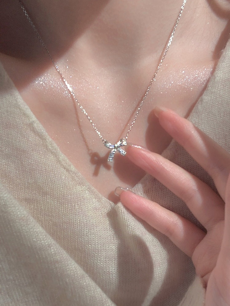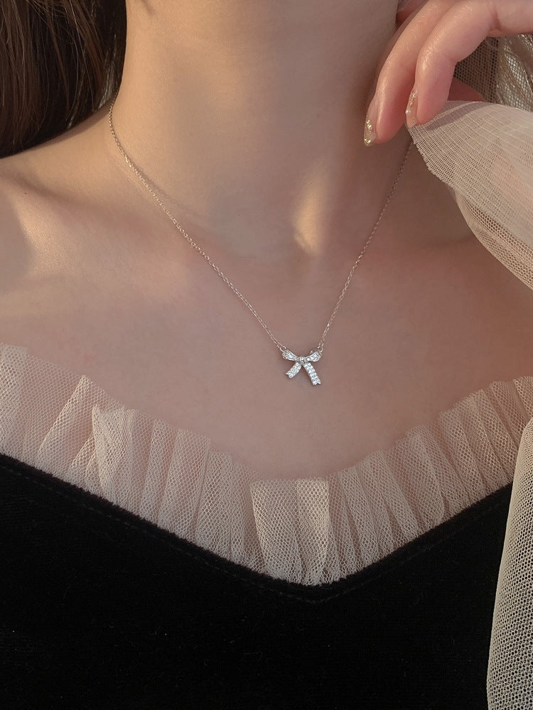 Zamansız zarafetin ve saf duyguların simgesi olan bu fiyonk kolye, gümüş renginin asaletiyle birleşerek kalplere dokunuyor. Işıltılı zirkon taşlarla süslenmiş fiyonk detayı, narin görünümüyle duygusal bir anlatım sunuyor.
