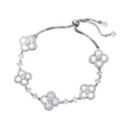Gemoria Zarif Çiçek Bileklik, zarafet ile feminenliğin kusursuz bir birleşimini sunar. İnci beyazı detaylarla süslenmiş dört yapraklı çiçek motifleri, şans ve saflığı temsil ederken, çevresini saran minik kristallerle ışığın zarif bir dansına ev sahipliği yapıyor.