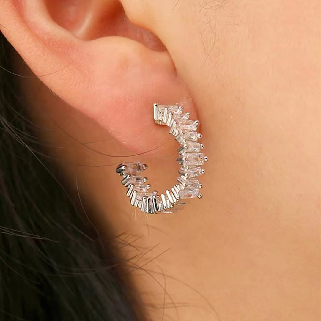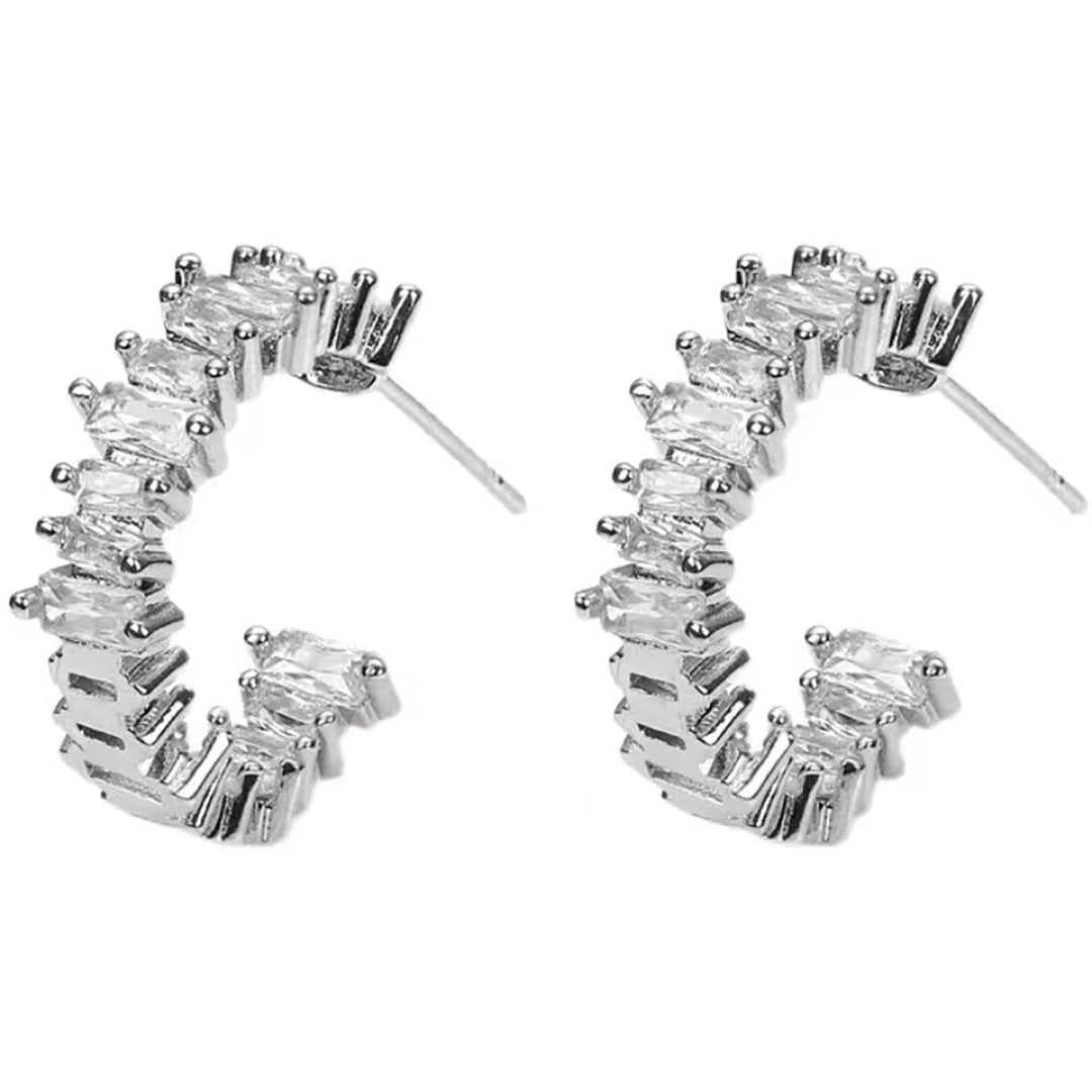Zarafeti ve modern ışıltıyı bir arada sunan bu gümüş rengi halka küpeler, gündelik stilinize göz alıcı bir dokunuş katmak için tasarlandı. Her biri özenle yerleştirilmiş zirkon taşlar, ışıkla buluştuğunda büyüleyici bir parlaklık sunar. Geceden gündüze tüm kombinlerinize sofistike bir tamamlayıcı olacak.